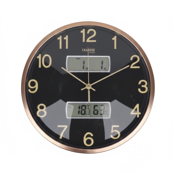 "Siyah kadranın derinliği ile hibrit teknolojinin işlevselliği buluşuyor; bu modern tasarım hem zamanı hem de odanızın iklimini şık bir dijital ekranla sunar."