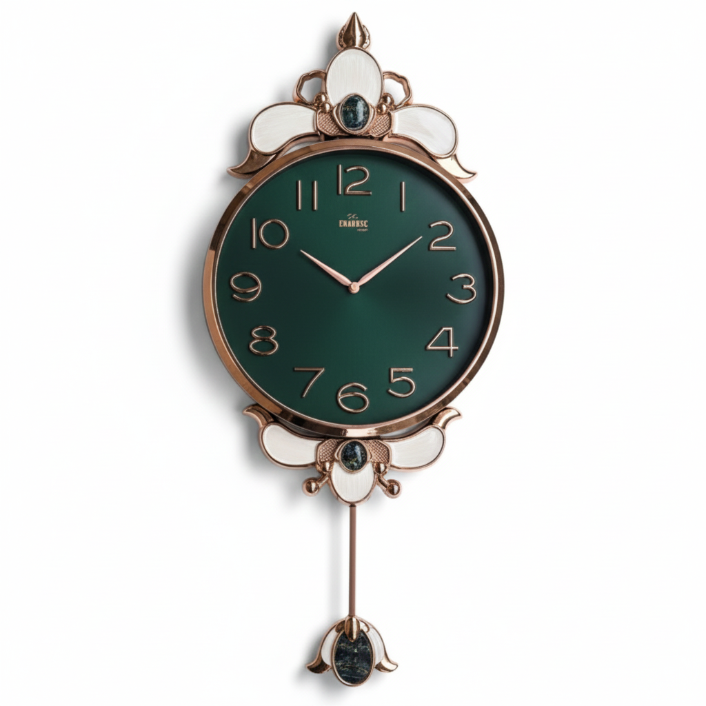 "Yeşilin huzur veren derinliğini sarkaçlı tasarımın klasik asaletiyle buluşturun; bu görkemli saat, hem hareketli bir sanat eseri gibi duvarınızı süsler hem de sessizliğiyle ruhunuzu dinlendirir."